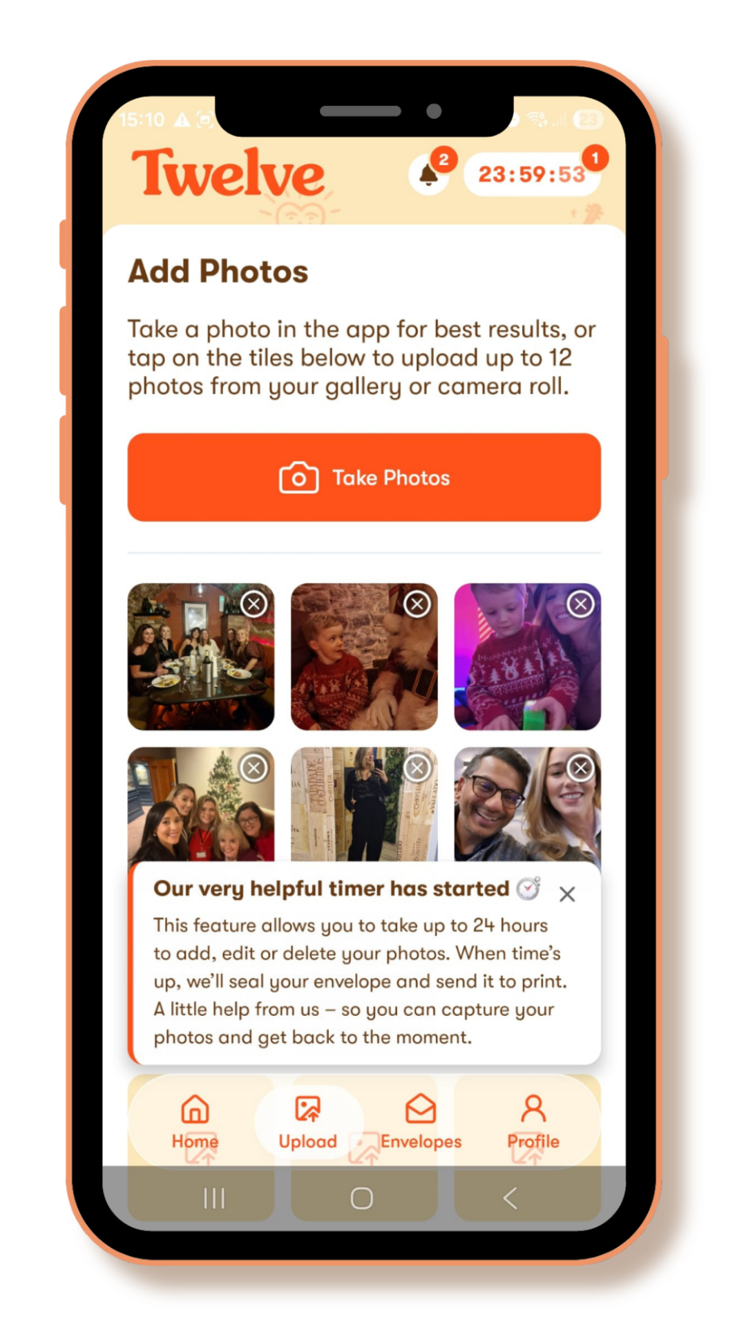 → Take your time to review the photos you want to print, or act in the moment. Add, edit or delete before the envelope seals and goes to print.